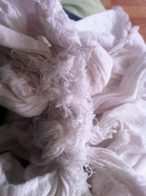 You see this?  THIS is what happens when you wash a load of unhemmed birdseye cloth napkins.  The fraying starts getting worse until they just can’t take it anymore and the threads begin to mate in an orgy of woven ecstasy.
