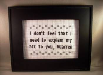 Cross-stitch was one of the first crafts I learned to do; my mother used to have a dozen half-finished projects around the house and they were all adorable.  I love that current crafters taken a usually staid art filled with Precious Moments figures and dancing teddy bears and turn it on its ear.  It makes it interesting AND hilarious.