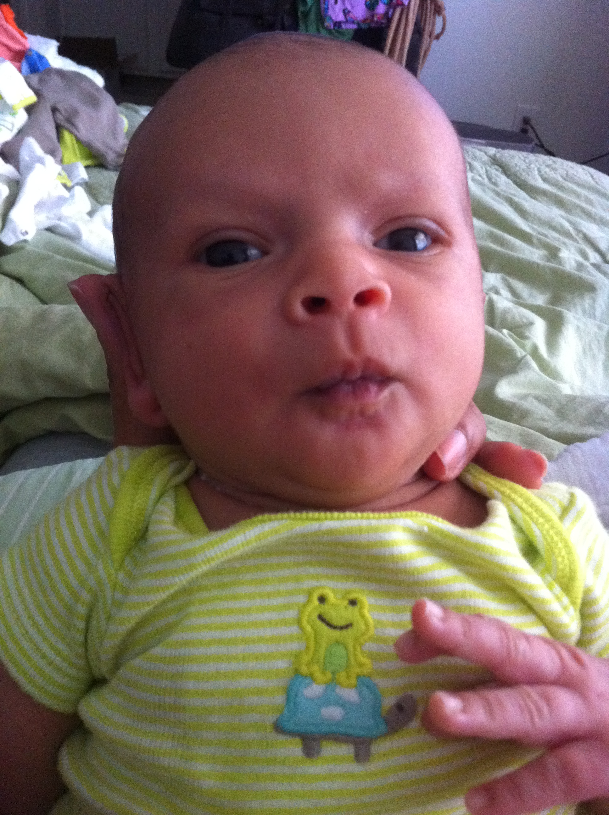 Wearing a gift from the lovely Sarah.  It came with pants with frogs on the feet.